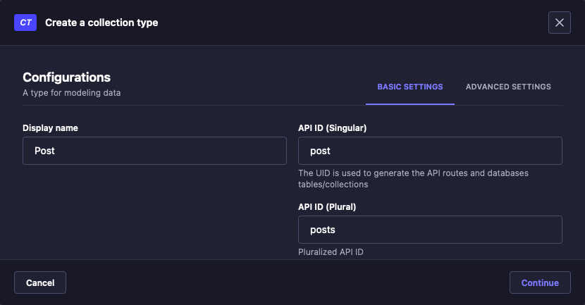 Postcollection type. Navigate to Content-type Builder, and select the Create new collection type option from the inner left menu. EnterPostfor the Display name field, and the API-related fields should populate on their own. Click Continue.In the form for adding a field to the new collection, select Text. Then on the next form enter