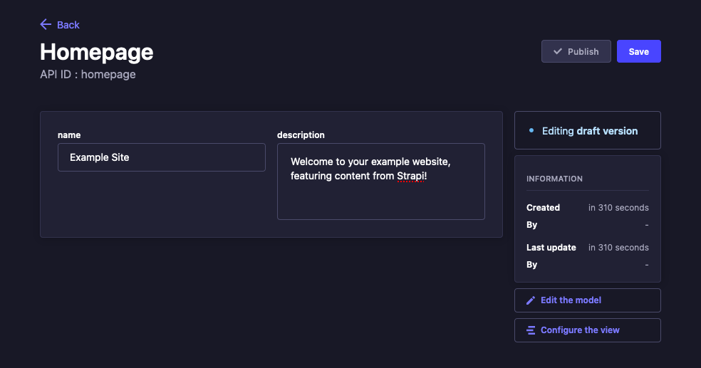 Example Siteand for description field, it usesWelcome to your example website, featuring content from Strapi!.Click Save from the upper right to save the changes you have made. Then, click Publish from the upper right to move the entry from Draft to Published status.