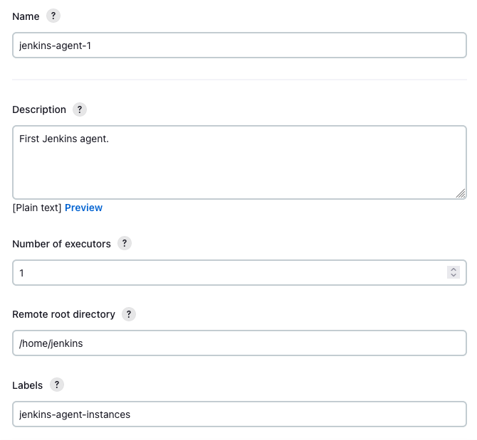 8081as the port.Create each of the agents from within the Jenkins dashboard. For each, navigate to Manage Jenkins > Manage Nodes and Clouds. Select the New Node button, and complete the agent configurations with the settings here.